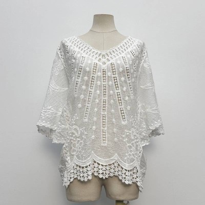 White Hollow Lace 3/4 Sleeve V-neck Chiffon Blouse Loose Temperament Niche Top