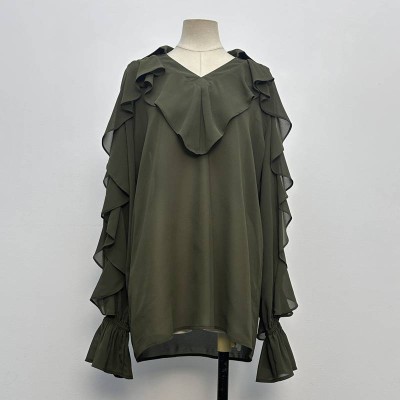 Dark Olive Green Ruffled V-neck Chiffon Long Sleeve Top