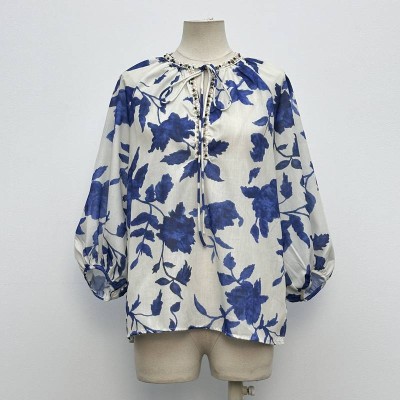 Blue and White Ink Print Lace-up Beaded Loose Chiffon Blouse