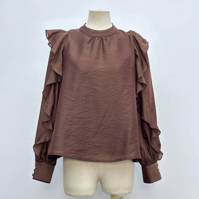 Vintage Stand Collar Ruffled Long Sleeve Chiffon Blouse Loose Solid Color Pullover Top