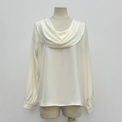 Elegant Satin Cowl Neck Long Sleeve Chiffon Top with Pearl Decor Loose Blouse
