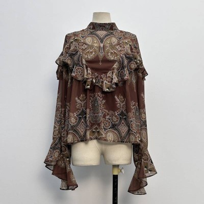 Vintage Paisley Print Ruffle Chiffon Blouse Loose Flare Sleeve Stand Collar Top