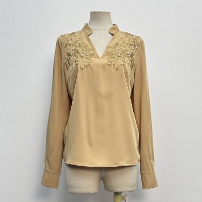 V-neck Embroidered Beaded Long-sleeve Chiffon Blouse Elegant Solid Color Loose Top