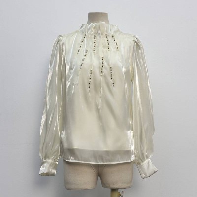 Shiny Stand Collar Beaded Long Sleeve Chiffon Blouse Elegant Versatile Top