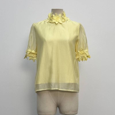 Yellow 3D Floral Stand Collar Short Sleeve Chiffon Shirt Elegant Gentle Style Lightweight Top