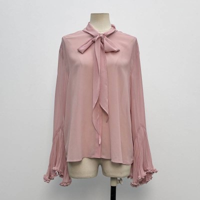 Pink Tie-neck Flared Sleeve Chiffon Blouse Elegant Long-sleeve Top