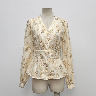 V-neck Waist-cinched Floral Long-sleeve Chiffon Blouse Elegant Slimming Gentle Style Top