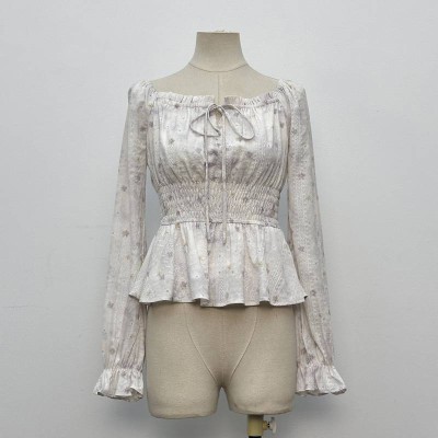 French Square Neck Floral Chiffon Blouse Waist Cinched Ruffle Long Sleeve Top