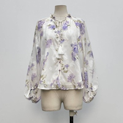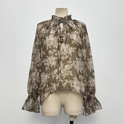 French Floral Tie Ruffle Long Sleeve Chiffon Blouse Gentle Style Loose Top