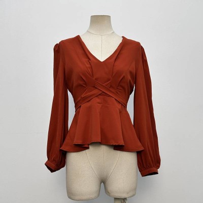 Retro Red V-neck Cross Waist Ruffle Long Sleeve Chiffon Top