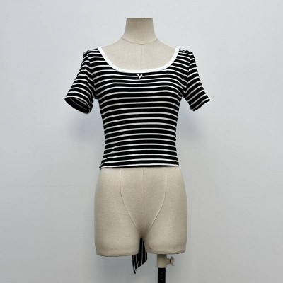 Black and White Striped Square Neck Short Sleeve Cropped Slim Top