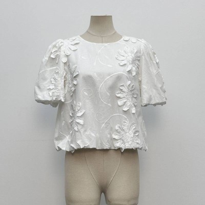 White 3D Floral Decor Puff Sleeve Cropped Top