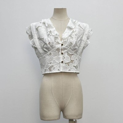 French White Lace Sleeveless V-neck Cropped Top Elegant Ruffled Hollow-out Waist-fitted Blouse