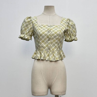 Fresh Plaid Square Neck Puff Sleeve Cropped Top Ruffled Waist Navel-exposed Blouse
