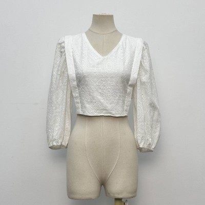 V-neck Hollow Embroidery Cropped Top Temperament Puff Sleeve Waist Slimming White Top
