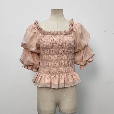 Pink Square Neck Shirred Puff Sleeve Cropped Top Sweet Waist Ruffled Blouse