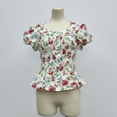 French Square Neck Floral Print Waist-cinched Short Top Puff Sleeve Slim Ruffled Blouse