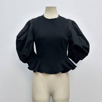 Black V-neck Ruffle Sleeve Waist Cinched Short Elegant Top
