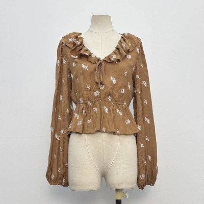 Vintage Brown Embroidered Ruffled Tie-Waist Cropped Long Sleeve Top
