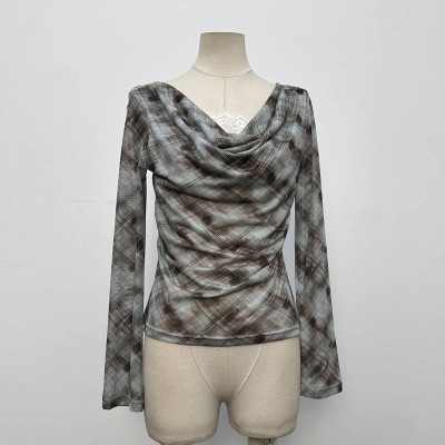 Plaid Draped Neck Long Sleeve Mesh Cropped Top