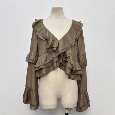V-neck Ruffled Long Sleeve Cropped Top Elegant Chic Blouse