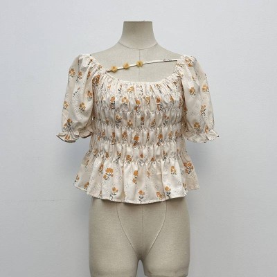 French Square Neck Floral Waist-cinched Short Top Bubble Sleeve Design Niche Unique Blouse