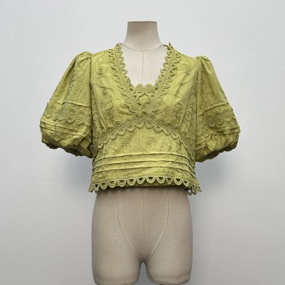 Vintage Lace V-neck Puff Sleeve Cropped Top Avocado Green Slim Fit Blouse