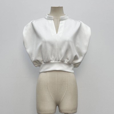 French Stand Collar V-neck Puff Sleeve Short Satin Top Waist Slimming Temperament White Blouse