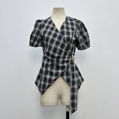 Vintage Plaid V-neck Puff Sleeve Waist Tie Short Sleeve Top