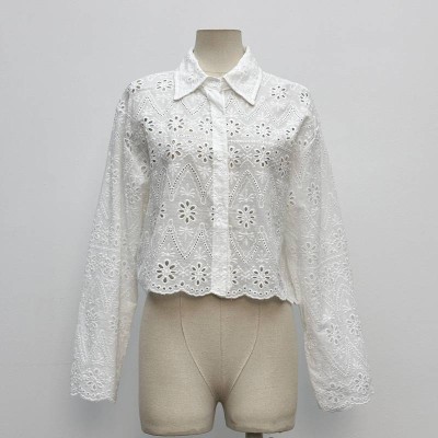 White Hollow Embroidery Short Lapel Long Sleeve Shirt