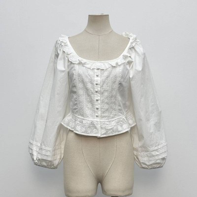 French Square Neck Ruffle Embroidered Cropped Top White Puff Sleeve Waist Shirt