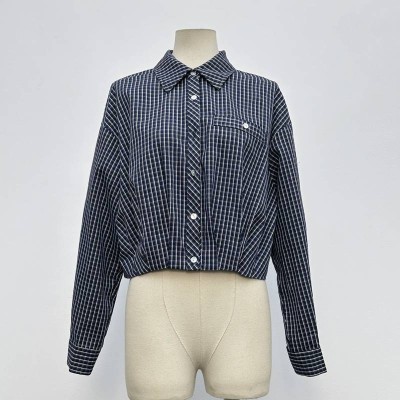 Vintage Blue and White Plaid Short Shirt Loose Lapel Long Sleeve Button-up Top