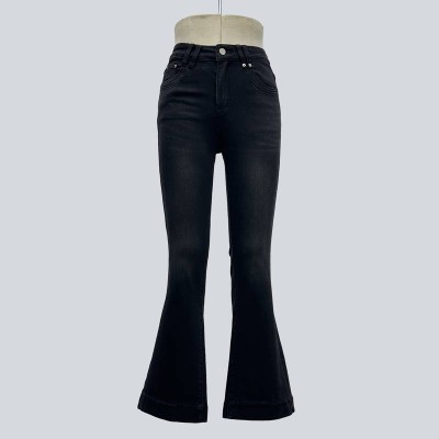 Vintage Washed Black Flare Jeans High Waist Slim Fit Cuffed Hem Bootcut Pants