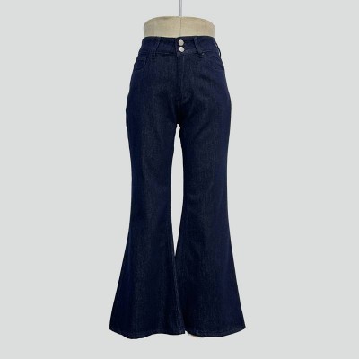 High Waist Double Button Flared Jeans Vintage Slim Dark Denim Trousers
