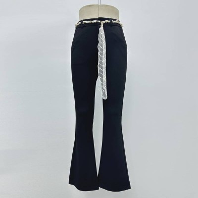 Elegant Black Flared Casual Pants with Pearl Lace Belt Decor Slim Long Pants