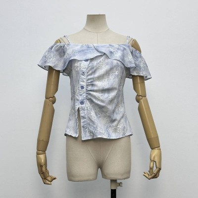 Blue-white Tie-dye Embroidery Off-the-shoulder Camisole Cropped Top Waist-cinching Women's Top