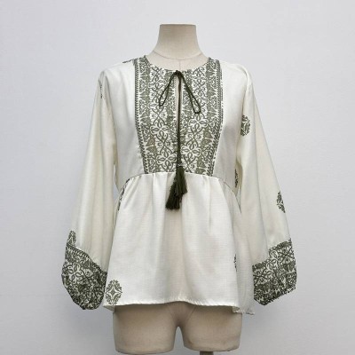 White V-neck Embroidered Textured Shirt Loose Casual Long-sleeve Top