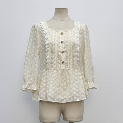 Square Neck Embroidered Waist-cinched 3/4 Sleeve Chiffon Top Gentle Style Sweet Slim Ruffle Blouse
