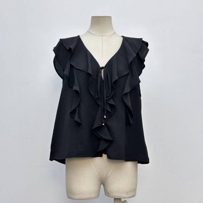 Black Ruffled V-neck Tie-up Sleeveless Chiffon Blouse