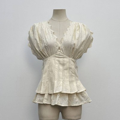 French V-neck Embroidered Waist Ruffled Sleeveless Top