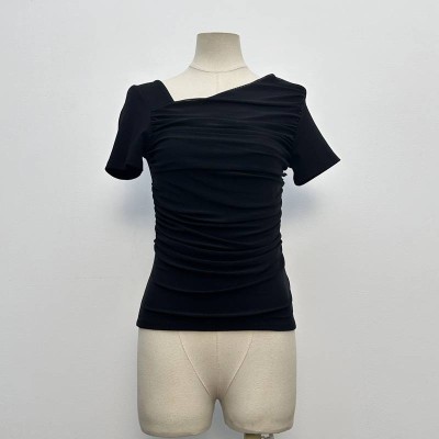 Black Oblique Neck Ruched Slim Short Sleeve Off-Shoulder Top