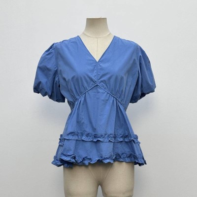 Blue V-neck Puff Sleeve Waist Cinched Ruffle Short Sleeve Blouse