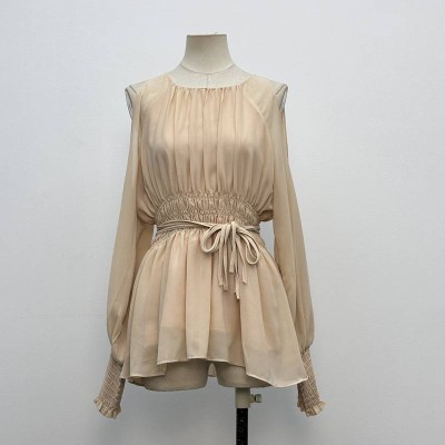Apricot Cold-Shoulder Chiffon Top With Drawstring Waist And Lantern Sleeves