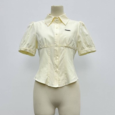 Cream Yellow Waist-cinched Puff Sleeve Short-sleeve Shirt, Temperament Slim Fit Lapel Button-down Top