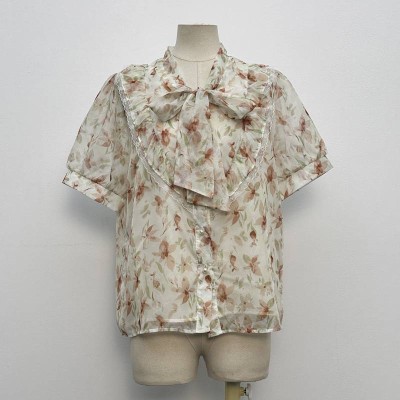 Floral Print Bow Tie Neck Short Sleeve Chiffon Blouse Women's Gentle Style Lightweight Breathable Shirt