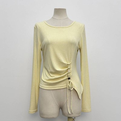Light Yellow Round Neck Drawstring Design Slim Fit Long Sleeve Top