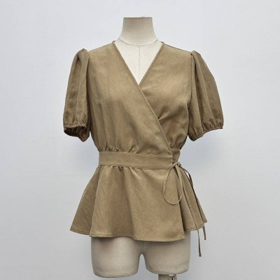 V-neck Puff Sleeve Waist Tie Short-sleeve Top Suede Style Slim Fit Women's Blouse