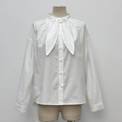 Simple Tie Neck Stand Collar White Shirt Loose Long Sleeve Commute Top