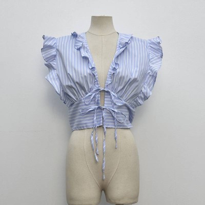 Blue & White Striped Ruffled V-neck Drawstring Cropped Sleeveless Top