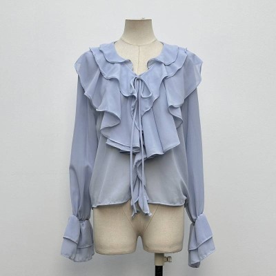Light Blue Ruffled Tie-Neck Chiffon Blouse Sweet Long Sleeve V-neck Top